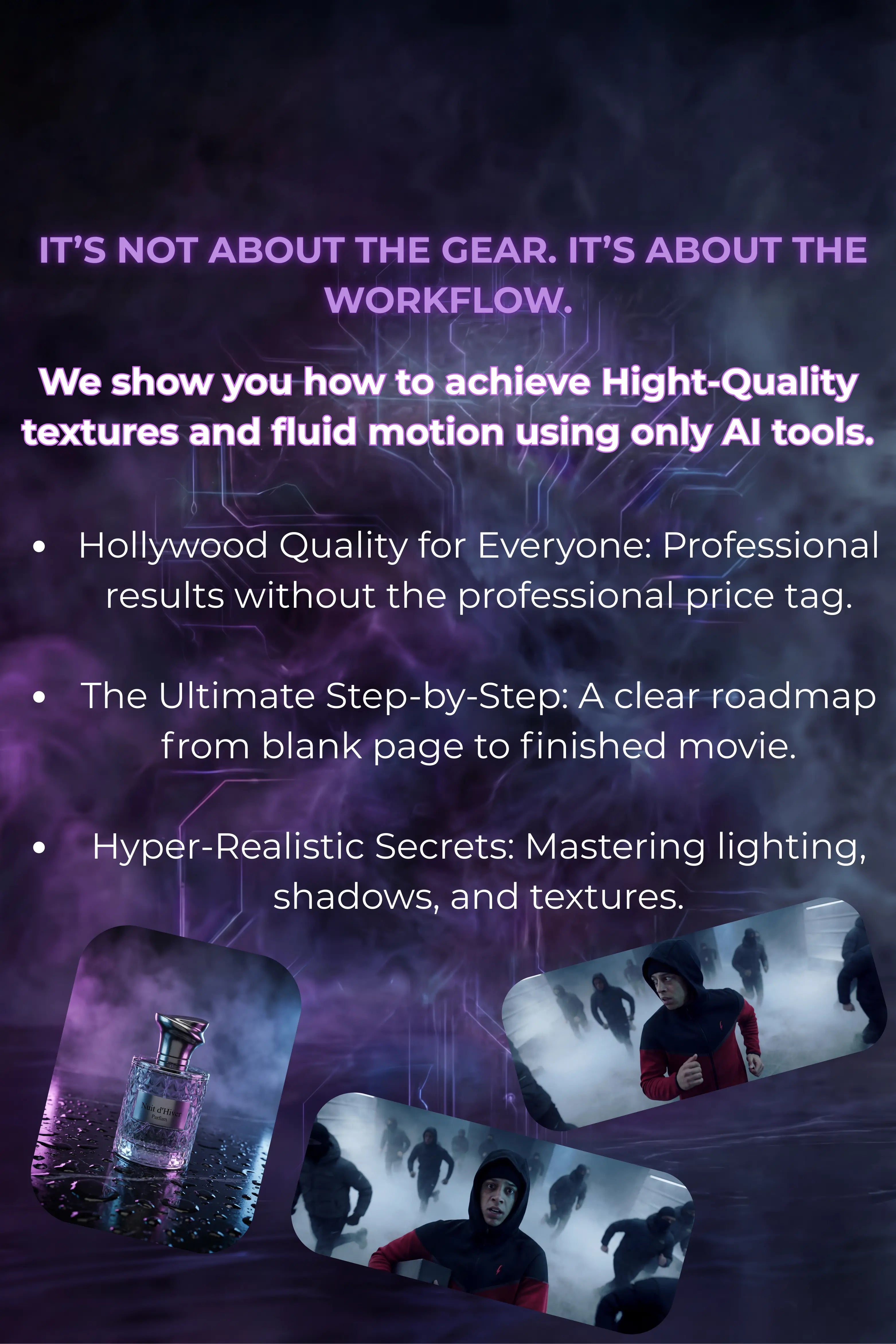 Gone are the days of waiting weeks for rendering. With our streamlined process, you can go from a blank page to a finished, high-quality cinematic clip in less than 2h. It’s about working smarter, not harder. And you'll find a platform recommended by our team in the ebook, where you'll find all the tools you need to achieve professional results.